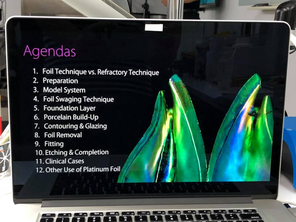 與壓鑄技術和耐火模代型技術相比,白金箔技術製成的貼面的邊緣完整性是一個問題,在這個實作課程的過程中,Aiba先生將展示他的白金箔技術PLV的每個步驟過程,3個重點關鍵來呈現更好的邊緣完整性:(1)模型準備,(2)白金箔壓接技術(3)遞增的陶瓷堆築技術